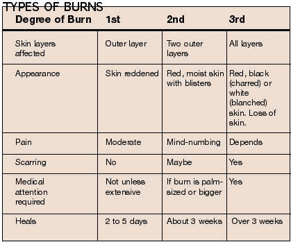 Burns are rated according to the amount of damage they do to the skin. There are first, second and third degree burns.