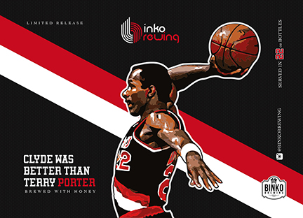When I wanted to pay tribute to Clyde Drexler, one of my all-time favorite NBA players, I remembered that he’d had a teammate on the Portland Trailblazers named Terry Porter. Terry is a two-time NBA All-Star and the Blazers’ all-time assists leader. But to me, Clyde, an Olympic gold medal winner and 10-time NBA All-Star, was always the better Blazer . . . and my Clyde Was Better Than Terry Porter beer was born. The Blazers’ black/red/white uniforms gave me a color palette, and I sketched out a label with Clyde in action and the word “Porter” popping out in a contrasting color from the rest of the name. I flipped the “P” in the Portland Trial Blazers logo to look like a “b” for brand recognition. The kicker was that Clyde wore #22, so naturally, this was only offered in 22-oz. bottles!