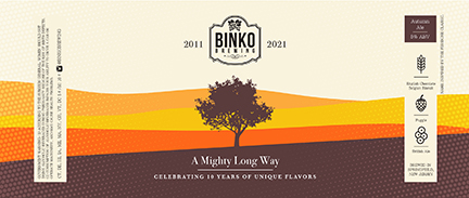 Speaking of anniversaries . . . this one marked the 10th anniversary of Binko Brewing! I love Fishbone, a punk-funk-soul-ska-whatever band from the 80s and 90s. I was trying to figure out a name for an anniversary brew and remembered the song “A Mighty Long Way” from their awesome Truth and Soul album. I wanted to keep the design simple, and while it was inspired by the band, I didn’t want it to be a “Fishbone beer.” An image of a single tree in the distance, a long way away, popped into my head, and the autumn anniversary date inspired the colors and the roasty brown ale style. I still can’t believe I’ve been brewing for more than 10 years!
