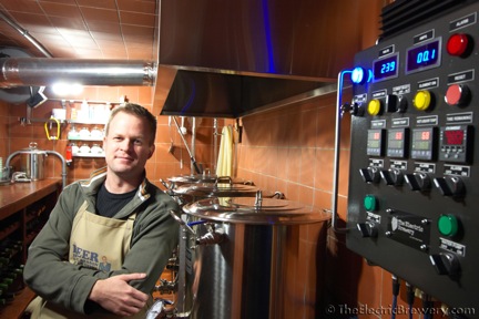 Man wearing a brewer's apron standing next to an electric brewing setup.