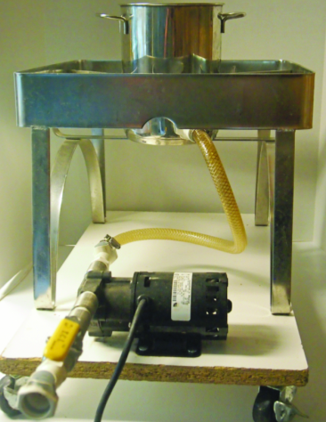 I use my March centrifugal pump in wort re-cycling, which I like to do as it clarifies the wort and settles the grain bed. It also helps to ensure good extraction of wort from the grains. About 15–20 minutes before the end of the mash I run the wort off to a 1-gallon (3.8-L) back then pump it back over the top of the grain bed. The back is actually a stainless steel vessel with an inlet at the top and outlet at the bottom (both fitted with quick disconnects); during re-cycle I just collect enough wort to cover the outlet before pumping it back over the bed, using a low flow rate so that the bed surface is not disturbed. When mashing is done I transfer the outlet tube to my boil kettle, commence wort run off into the back (turning on sparge water as appropriate), switching on the pump to empty the back when it is full. When all the wort has been transferred to the boiler, I remove the outlet tube from the boiler, place it in a bucket and clean the back, pump and tubing by pumping through a gallon or two (3.7-7.5 liters) of very hot water.