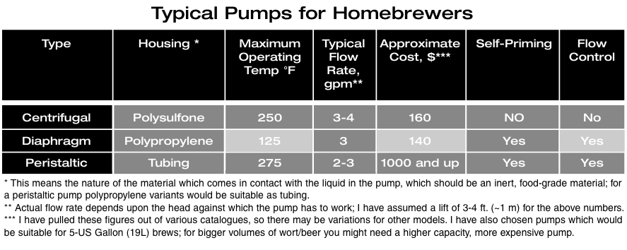 But before you go pump shopping, first think about what exactly you want your pump to do. For example, a pump that is fine for transferring beer from a carboy to a keg may well have different characteristics from one that is used for moving hot wort from a mash tun to a boiling kettle. What’s more, you will see that there are a variety of brewing operations in which a pump may be useful, so that versatility may play an important part in your choice of pump. So with that in mind, let’s explore the types of pumps available to homebrewers and their pros and cons.