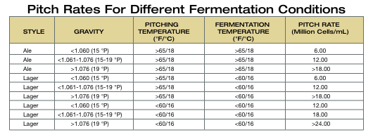 Pitching 1 million cells per mL per degree Plato is a standard rule of thumb used in commercial breweries. For example, a 14 °Plato wort is pitched with 14 million cells per mL. This generally applies to yeast being harvested and re-pitched from alcoholic fermentations. Yeast coming from a laboratory is in optimal condition and can be pitched at a lower rate. When using laboratory-grown yeast culture in standard ale fermentations (< 15 °P at 70 °F/21 °C), pitch rates of 6 million cells per mL are recommended. The chart on page 38 shows pitch rates required for laboratory grown cultures under different fermentation conditions.