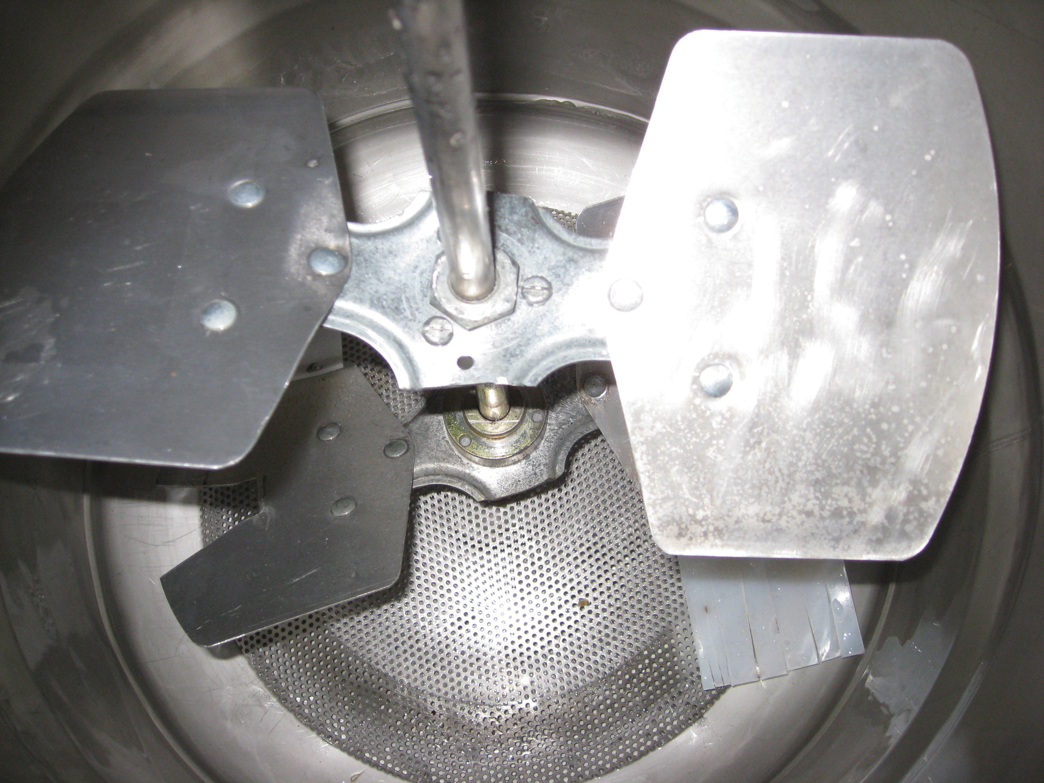 The second and third key features of the modern mash mixer are tied at the hip, so I will discuss them together; these features are the mixer and the heating jacket. The primary purpose of the mixer is to move the mash around in order to provide uniform heat transfer from the steam jacket to the mash. If the mixer is run too slowly, or simply turned off for experimental purposes, the mash touching the steam jackets will become very hot and begin to boil, but the mash a few inches into the center is slow to react to the heat because mash is thick and does not develop convection currents like pots of liquids that do not contain solids. The home cook knows to gently stir a pot of chili when placed on high heat to avoid scorching the bottom of the pan and the food adjacent to the heat source, and this is really how the mixer is used in a mash mixer.
