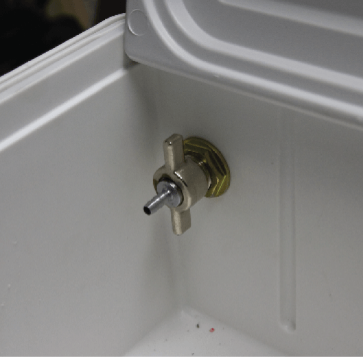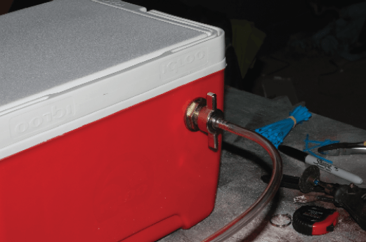 With the faucet and inlet shanks cut, fit, and secured, all that remains is to connect the coil to the shanks. Cut two short lengths of vinyl tubing and slide them onto the hose barbs on the shank tailpieces. Onto the inlet side vinyl tubing, slide two hose clamps and then insert one end of the copper coil into the vinyl tubing; tighten one clamp on the hose barb and the other where the vinyl overlaps the copper tubing. Repeat the same procedure for the faucet side hardware. Now secure the faucet to the front shank and connect the vinyl tubing from a keg to the outside inlet tailpiece. Next, test the box for leaks. Once leak testing is complete, load the box with ice and a little water. Hook up a keg of homebrew and experiment with gas pressure and hookup tubing length to get it dialed in for a smooth pour.