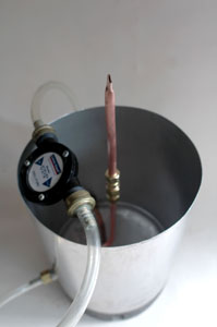 Liquid is stored in the bottom of the container and then pumped into a spray wand. Both the intake and spray wand were bent out of scrap 3/8” (10 mm) tubing using a tubing bender. You might like to use the stainless steel keg spear; I chose copper, it is easier to bend.