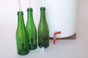 Cut a sheet of thin plywood to fit into the bottling device and mark the centers of each of your wands. Measure the bottom of this bottle style and cut a circle around each center. Then when it comes time to bottle, be it Belgian-style with 3 1/4” bases, longnecks for competition (2 3/8”), or my preferred bail-top bottles (3 1/16” and 3 3/8”), accurate centering will be almost automatic. Of course having hole saws of the appropriate diameter would be a huge help!