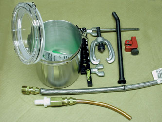 You’ll need your container, the parts to make two bulkhead fittings that will go through the container wall, a tubing cutter, a spring-type tubing bender, flare fitting tools and the stainless-steel flexible hose that we will use for both the filter and the inlet tube.