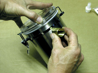 Next, bend the tube to 90 degrees or as required. I recommend spending $5 and buying a set of the spring-type tubing benders, or other tube benders, to save headaches when the tube collapses. If you’re using a compression fitting, install the gasket. Cut excess length from the tube, leaving the discharge end close to but not touching either the top or side of your container.