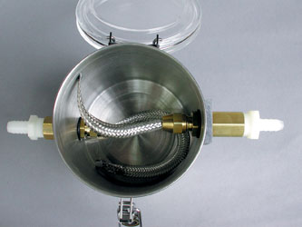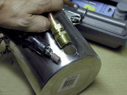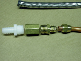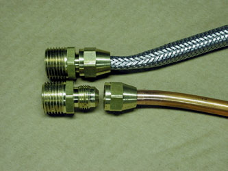 Stainless-flex option: On the inside of the container, another flare fitting makes connecting a bit of stainless flex as simple as the filter. Crimp and seal the discharge end, then slip a rod nut over the open end and push the flex onto the flare fitting. Screw gently.