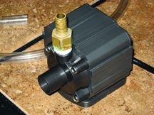The pump I used when building this project is rated at 370 GPH, or about 6.2 gallons per minute (GPM), and has a maximum operating head pressure of 10 feet. Again, these ratings are maximums under ideal conditions. My setup is almost identical to the example given above and I get a flow rate of about 1.25 GPM through the recirculating chiller at a calculated head pressure of 8.5 feet. As the head pressure of the system increases, the flow rate of the pump decreases. Outdoor pond pumps are a good and cheap way to go, and submersible sump pumps will also work quite well. Both are available at home centers, and pond pumps are available at most pet stores or online.