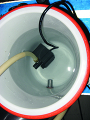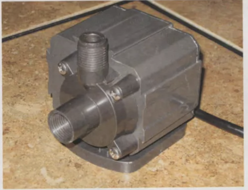 Attach some tubing to the pump’s outlet, which may require a fitting. I used a 1⁄2-inch female NPT to 1⁄2-inch hose barb fitting to make attaching the tubing easier. It is unnecessary to attach anything to the pump’s inlet connection, and doing so will add to the system head pressure. Lower the pump into the reservoir, but don’t connect it to the immersion chiller.