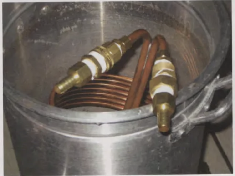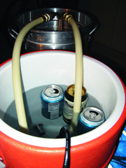 A bucket will work fine, but a cooler will help it stay cold a bit longer as well as allow you to chill the water ahead of time and keep it cool until you’re ready to use it. For ice, you could just use a couple of bags of ice from a local store, but that’s not the DIY spirit (and it costs more). As an alternative, you can fill about a dozen aluminum soda or beer cans and freeze them. I picked up this great trick from the Covert Hops Society brew club based in Atlanta, Georgia. You can also add salt to the ice water in the reservoir to drop the temperature a few more degrees. Why this works is outside the scope of this article, but Googling the term “freezing point depression” will give a good explanation.