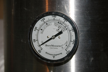 First, calibrate the thermometer following the manufacturer’s instructions.  The Blichmann Brewmometer dial reads from 60–220 °F (16–104 °C) with several important brewing temperatures marked, making it ideal for use for both boiling wort and mashing and sparging grain (Fig. 8).